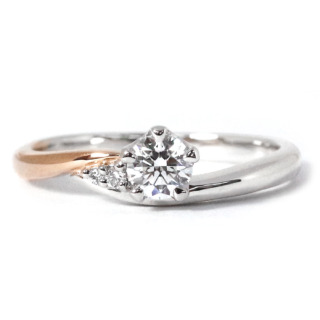 なめらかなウエーブの上に、ダイヤモンドを乗せた女性らしいフォルムの婚約指輪。2石のメレダイヤをサイドに添えた清楚な佇まいが美しいデザインです。小指側にはピンクゴールドをあしらったプラチナとのコンビネーションは、二色の地金が楽しめる大人の洗練リングです。