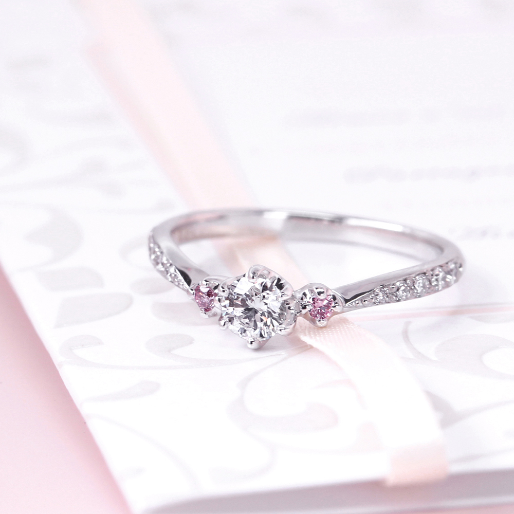 ほっそりとシャープなラインのV字のフォルムに、小さなメレダイヤが煌めくアームは、くすり指を細く長く、華奢に演出してくれる女性らしいデザイン。細みのアームの両サイドにアレンジしたピンクダイヤモンドが、さらにフェミニンさを醸し出します。