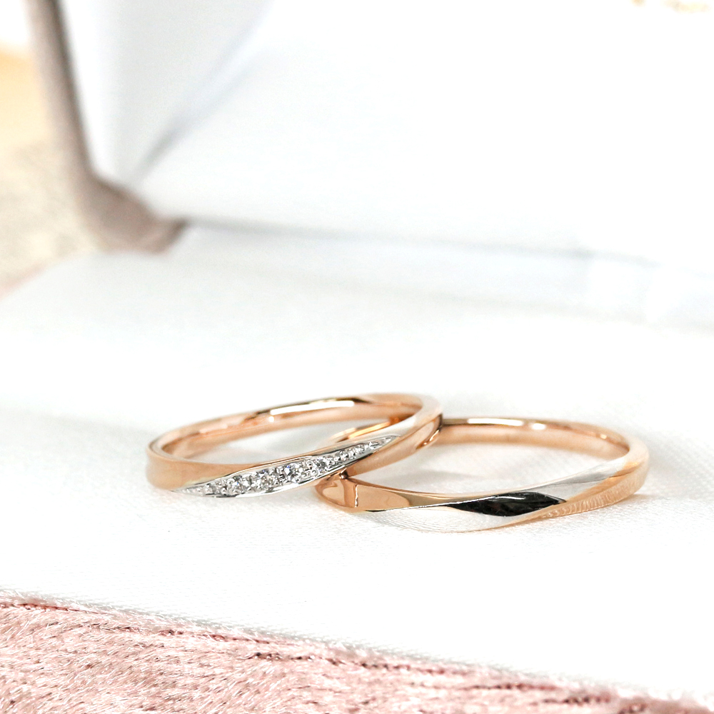 ほんのりと柔らかいカーブが特徴のコンビネーションリング。ピンクゴールドをメインにセンターにプラチナを使用することで、ダイヤモンドの透明感を際立たせたコンビのデザイン。5石のダイヤモンドがウエーブラインに沿って連なる女性らしいデザインで、フィット感もとても柔らか。普段指輪を着け慣れない男性にも好評な着け心地です。シンプルなデザインとコンビの洗練された雰囲気を併せ持つ、長く愛用できるリングです。